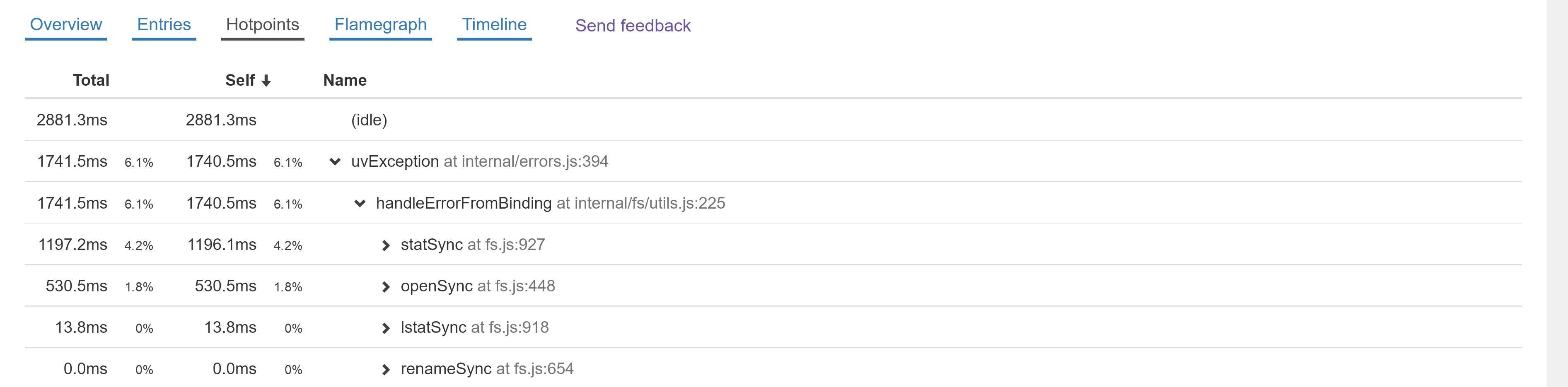 The next 4 rows show the functions that called handleErrorFromBinding. They show that uvException spent 1196.1ms when statSync called handleErrorFromBinding and 530.5ms when openSync called handleErrorFromBinding.