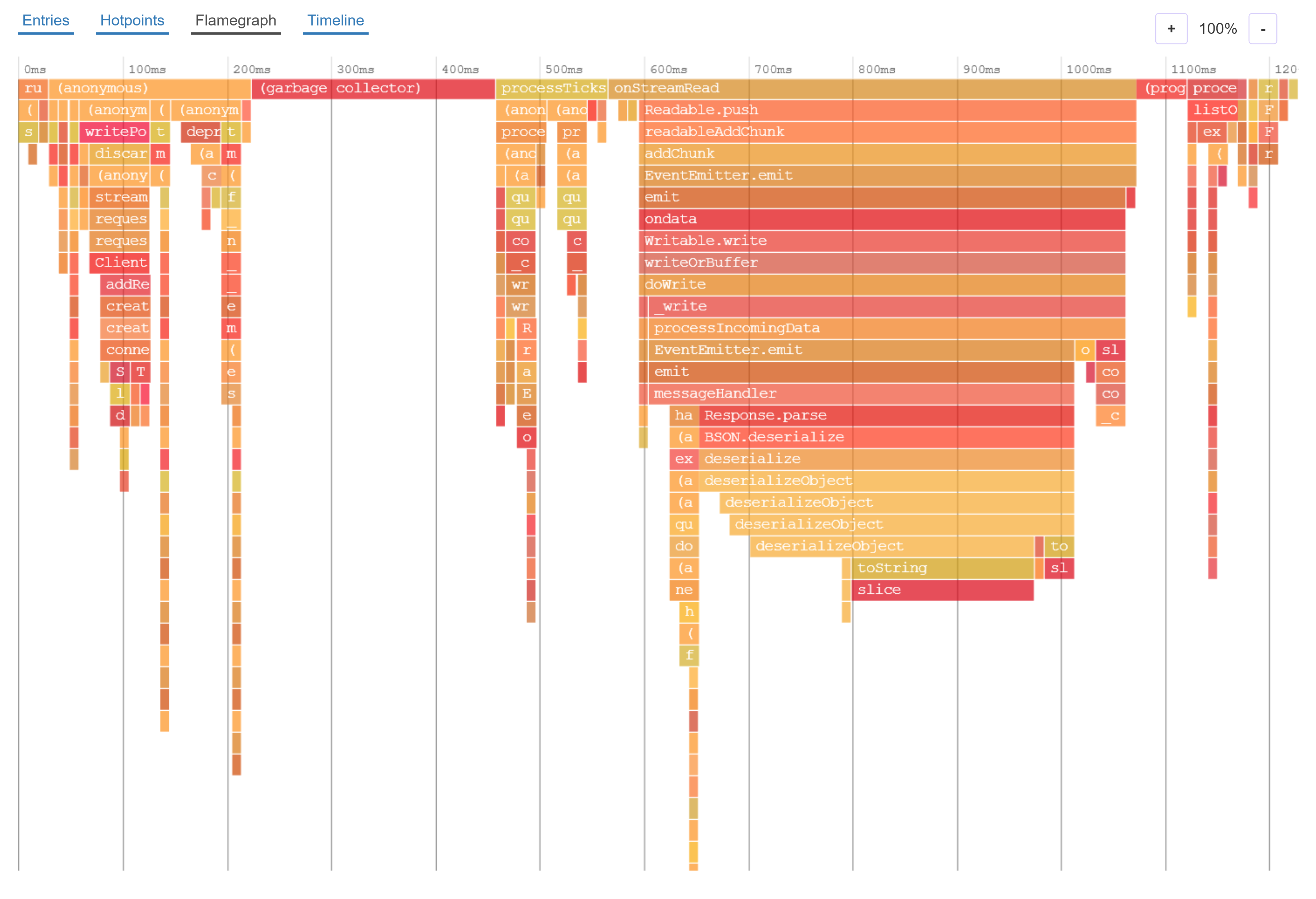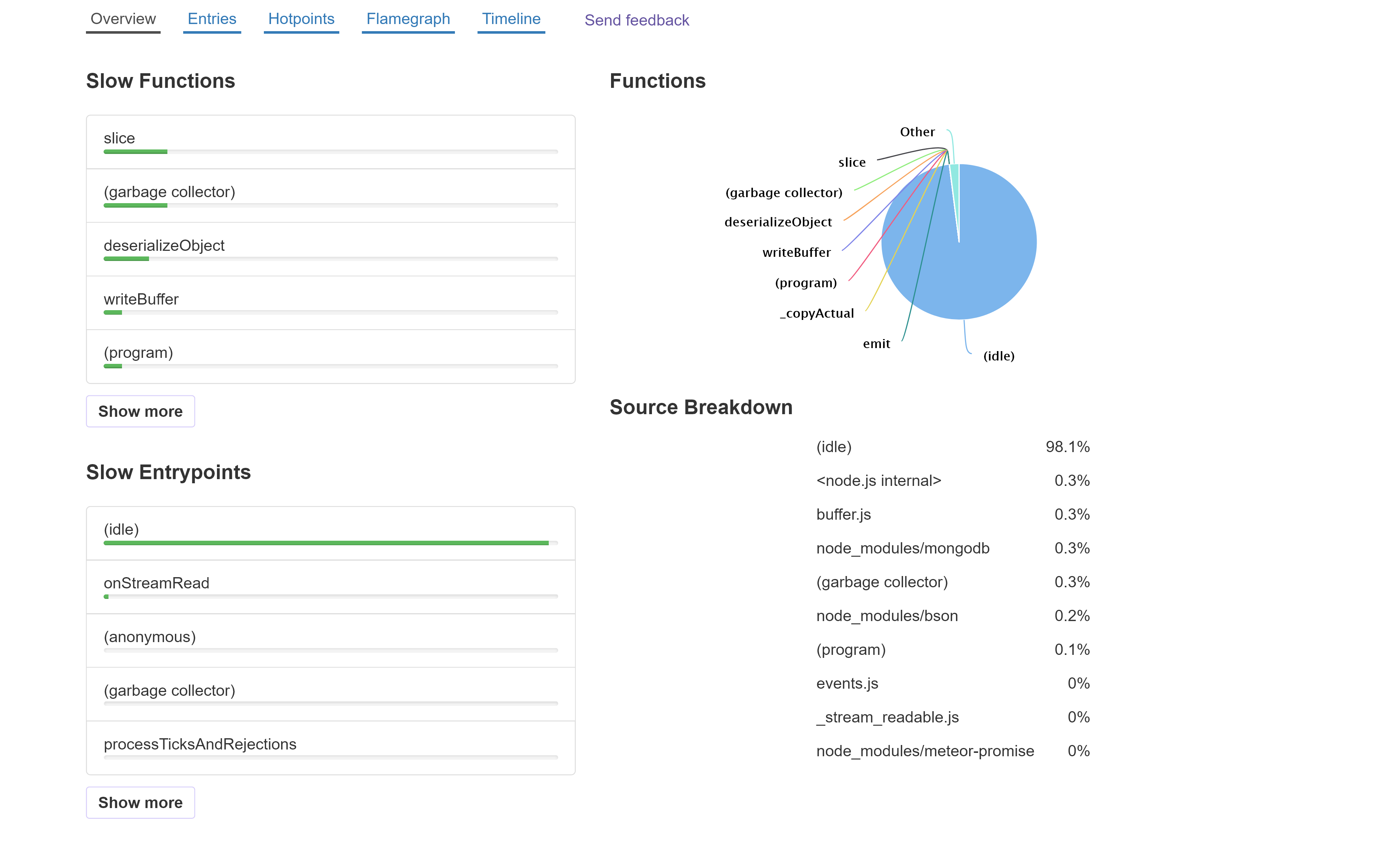 On the left, we have a list of functions in the app, sorted from slowest to fastest. Beneath that is a list of entry points - the initial functions that are called by v8 when code is run from starting the app or from the event loop.